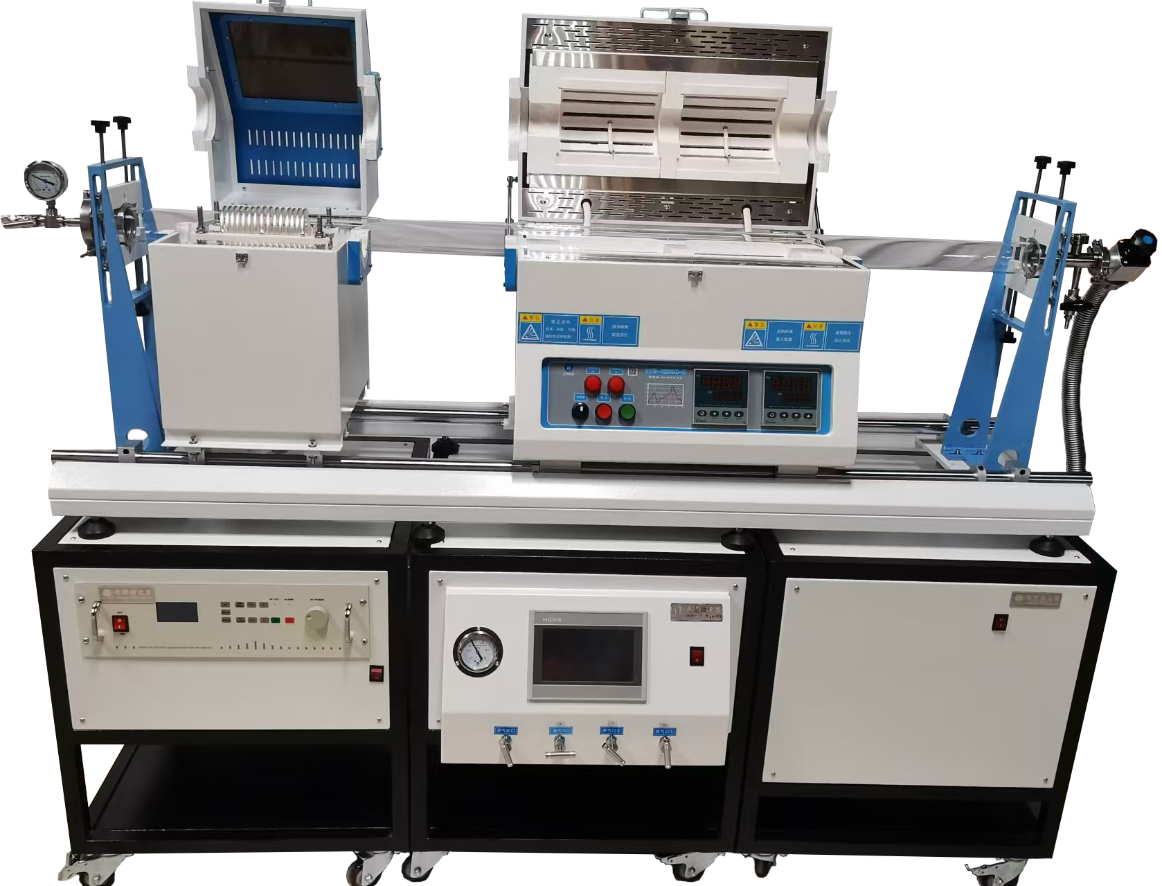 爐體結構 | ?爐體可以左右位移 ,射頻電源可以左右位移,爐體和射頻電源同時安裝在同一個滑軌上,使用同一根石英管 |